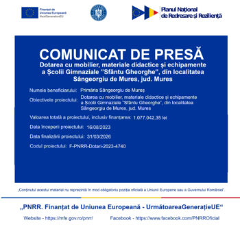 - Nume proiect: Dotarea cu mobilier, materiale didactice și echipamente a Școlii Gimnaziale „Sfântu Gheorghe”, din localitatea Sângeorgiu de Mureș, jud. Mureș