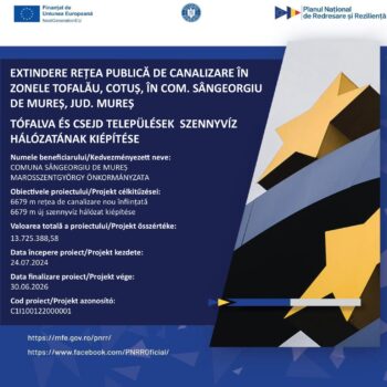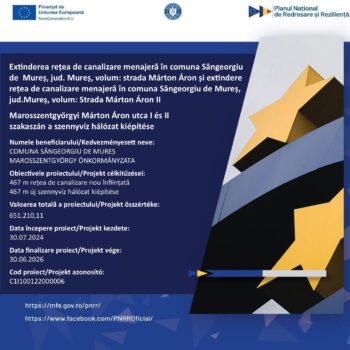 Marosszentgyörgy község önkormányzata két jelentős projektet valósít meg a község csatornahálózatának bővítése érdekében, a Nemzeti Helyreállítási és Rezilienciaépítési Terv (PNRR) keretében, azzal a céllal, hogy javítsa a víz- és csatornahálózati infrastruktúrát a lakosok számára.