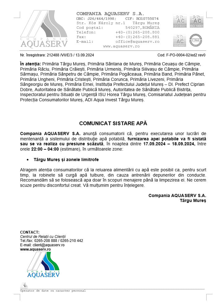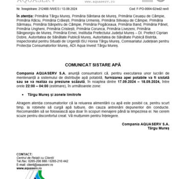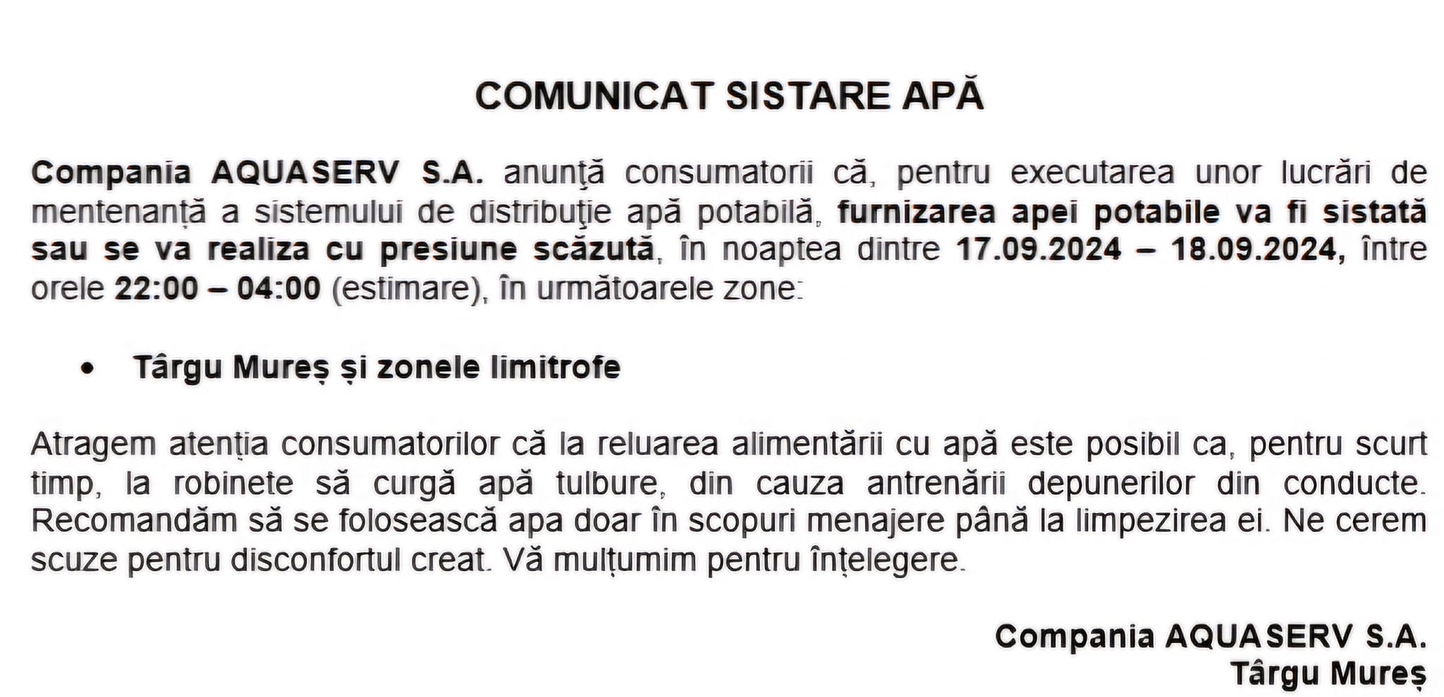 MAROSSZENTGYÖRGY teljes területén szünetel a vízszolgáltatás HOLNAP (2024 szeptember 17-én, kedden) ÉJSZAKA!