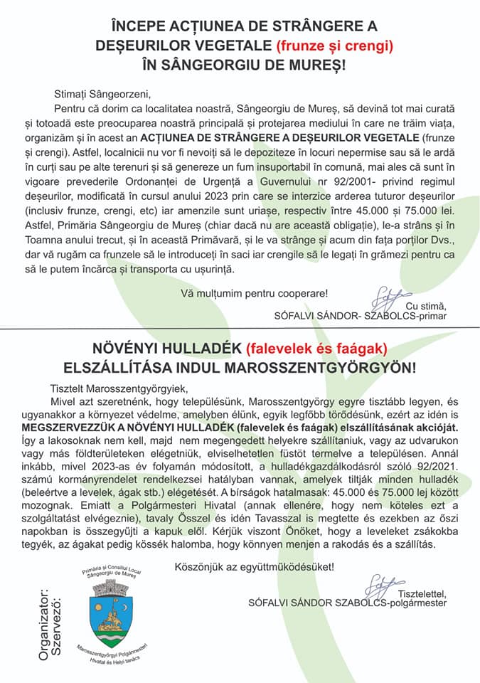 Megkezdődik a NÖVÉNYI HULLADÉKOK (ágak és levelek) gyűjtése községünkben!