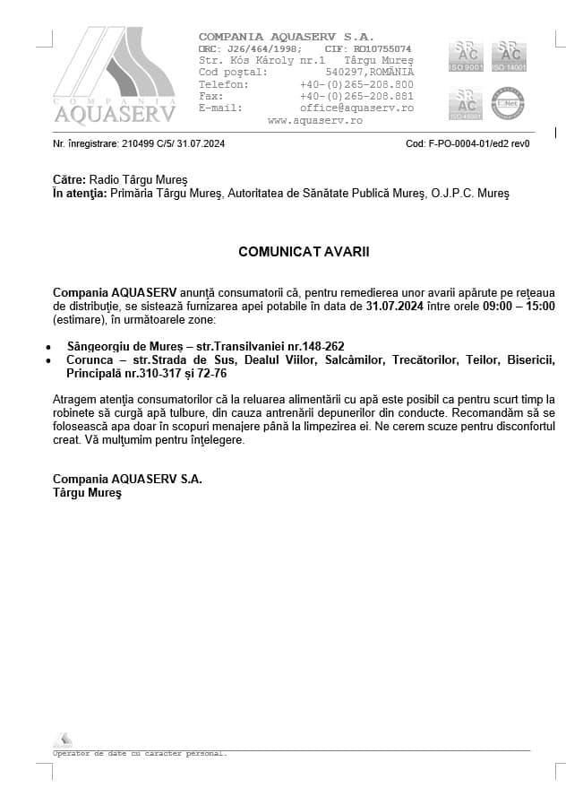 SZÜNETEL ma a vízszolgáltatás az Erdélyi utca 148-262 számok között!
