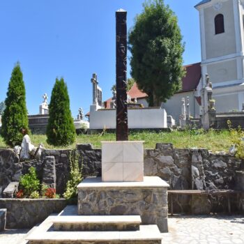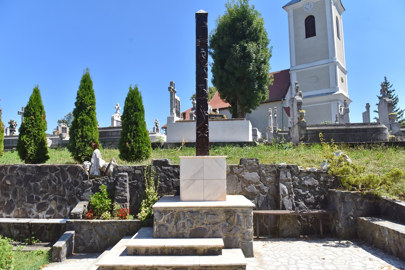 280 cm magas obeliszk, amelybe Szent György életét faragta bele Szántó Árpád és Kiss Ákos, kopjafa-motívumokat is felhasználva. Az oszlop alsó része a sárkányt, felső része Szent Györgyöt ábrázolja. Az emlékmű szimbolikája a jó és rossz küzdelmét mutatja be. Szent György a hit bajnokaként legyőzi a Gonoszt ábrázoló sárkányt megtestesítve azt a küzdelmet, amely a mai napig zajlik minden emberi lélekben és közösségben. A Nap, a Hold valamint a szent dicsfénye az isteni erő jelképe, amely a hit által képes legyőzni az ember elpusztítására törekvő Gonoszt. A Konrád Árpád műépítész által tervezett emlékművet 2001. április 26-án avatták fel.